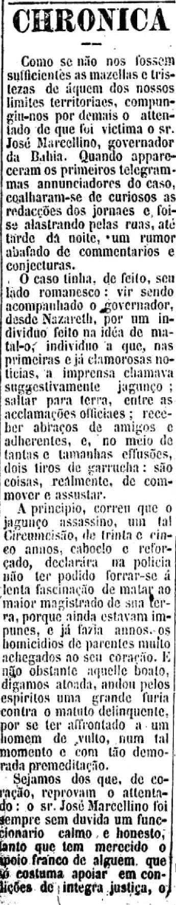 o sr. José Marcellino, governador da Bahia. Quando apareceram os primeiros telegramas anunciadores do caso, coalharam-se de curiosos as redações dos