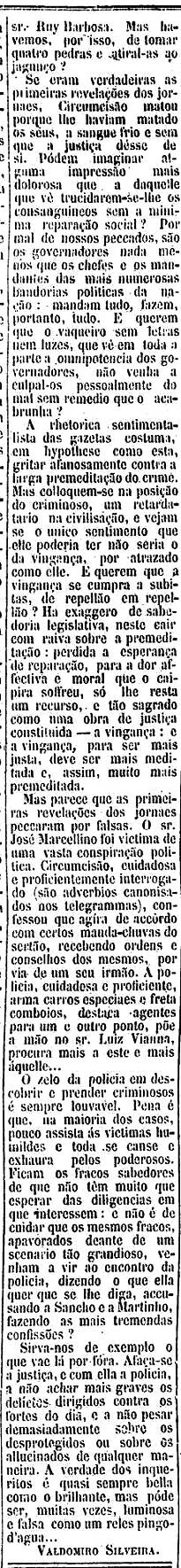 de íntegra justiça, o sr. Ruy Barbosa. Mas havemos, por isso, de tomar quatro pedras e atirá-las ao jagunço?