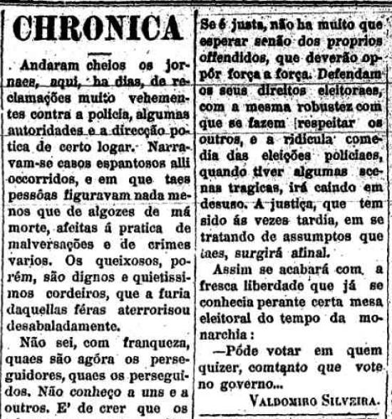 cheios os jornais, aqui, há dias, de reclamações muito veementes contra a polícia, algumas autoridades e a direção política de certo lugar.