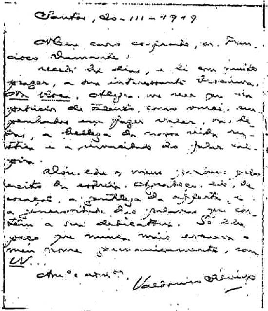 "V" e não com o "W" saxão ou germânico. Guardo entre os papéis de família um velho testemunho desse zelo: a carta que escreveu em 1919 a meu pai,
