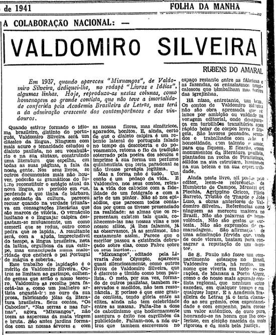Quando estiver formado o idioma brasileiro, distinto do português, Valdomiro Silveira será um clássico da língua. Ninguém com mais acuro e tenacidade estudou o dialeto paulista, no seu vocabulário e