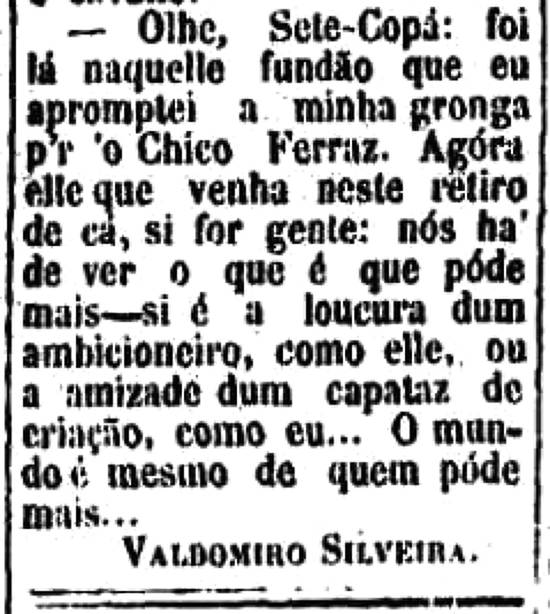 neste retiro de cá, si for gente: nós há de ver o que é que pode mais – si é a loucura dum ambicioneiro, como ele, ou a amizade dum capataz de