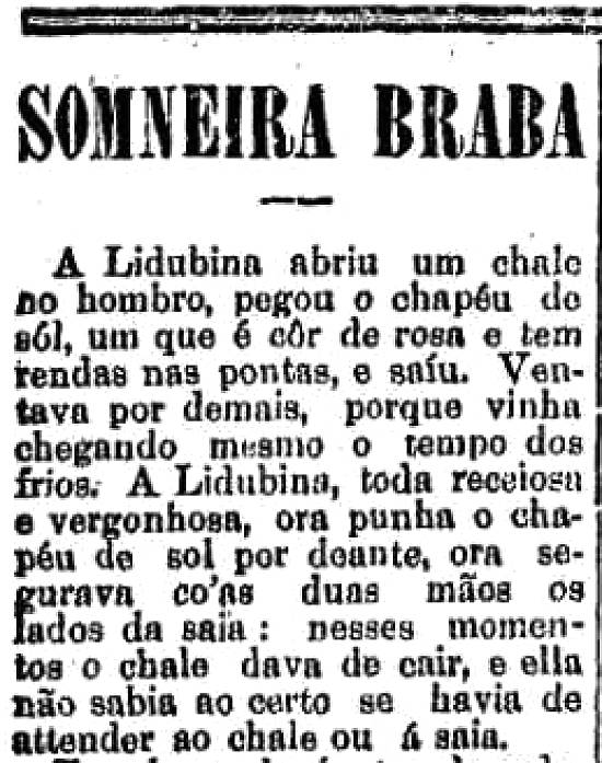 demais, porque vinha chegando mesmo o tempo dos frios. A Lidubina, toda receosa e vergonhosa, ora punha o chapéu de sol por diante, ora segurava