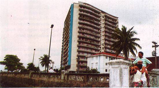 majestosos pilares vermelhos. Cerca de 80 famílias residem no prédio e o restante dos moradores são ocasionais. Há apartamentos de diversos