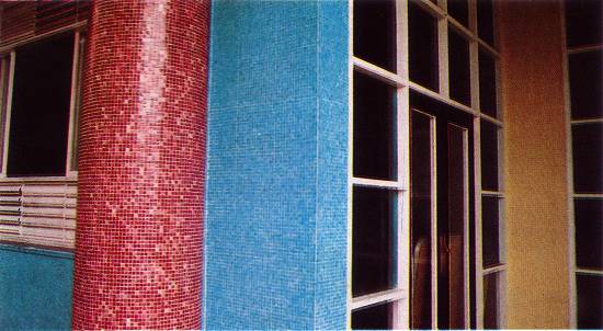 Detalhe de canto de paredes revestidas com pastilha no edifício Enseada