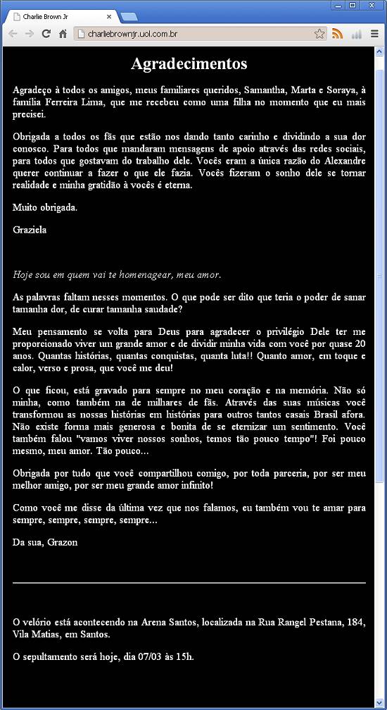 Chorão, do Charlie Brown Jr, é encontrado morto em São Paulo (em português). Portal Terra (6 de março de 2013). Página visitada em