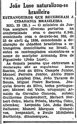 cidadãos brasileiros a estrangeiros domiciliados no Brasil. E entre os contemplados encontra-se o nome do escritor Armando Erse de Figueiredo (João Luso).