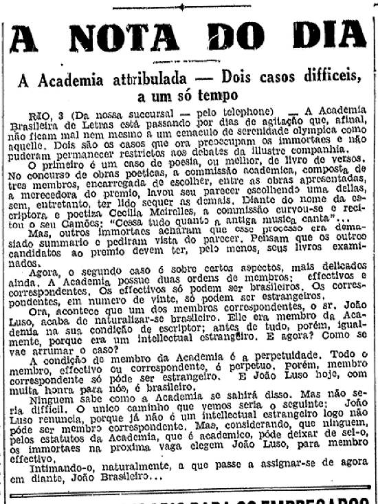 Ora, acontece que um dos membros correspondentes, o sr. João Luso, acaba de naturalizar-se brasileiro. Ele era membro da Academia na sua condição de escritor; antes de tudo, porém, igualmente,