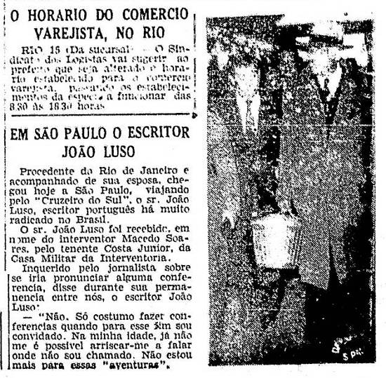 Uma visita de João Luso a São Paulo foi assim noticiada na última edição noturna do jornal paulistano Folha da Noite de quarta-feira, 15 de maio de 1946,