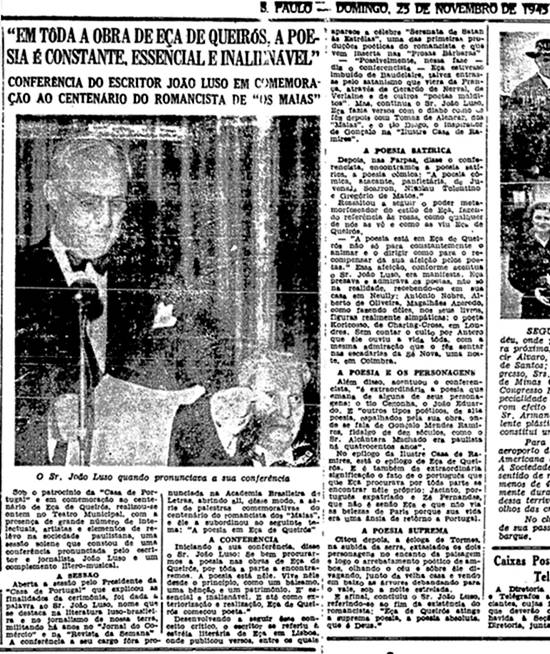 Uma conferência de João Luso foi detalhada no jornal paulistano Folha da Manhã de domingo, 25 de novembro de 1945,