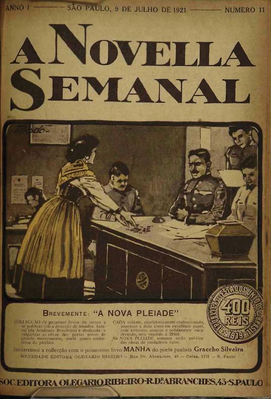 Um amanuense começou com indiferente pachorra a encher de rabiscos a página dum talão. Palpitante, a moça esperava, seguindo com o olhar as viagens do papelucho, que ia de mão em mão, para este assinar, para aquel'outro fazer o assento nos
