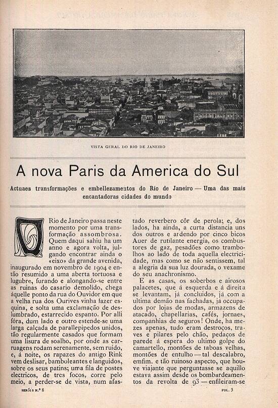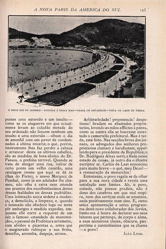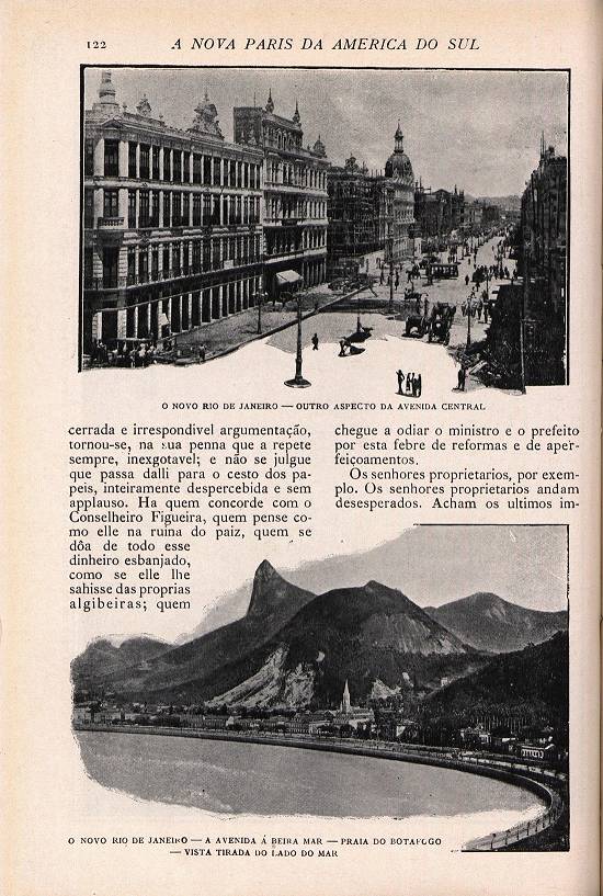 edifícios que se levantam do terreno dos casebres arrasados; na magnificência dos cais que sufocaram o espreguiçamento moleirão das ondas sujas; e na garridice da Avenida à beira-mar, que já por toda a velha praia de Botafogo faz faiscar ao sol