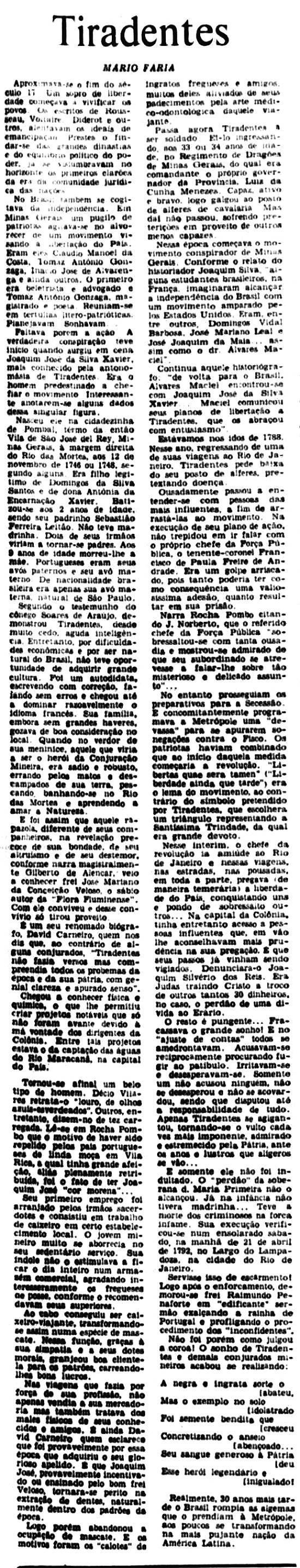 Artigo "Tiradentes", publicado em A Tribuna em 19/4/1977, página 13: