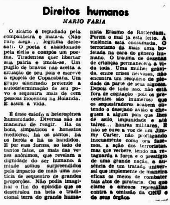 Artigo "Direitos Humanos" saiu em A Tribuna em 19/6/1977, página 30: