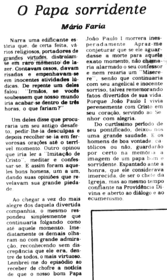 Artigo "O papa sorridente", publicado em A Tribuna em 7/10/1978, página 23: