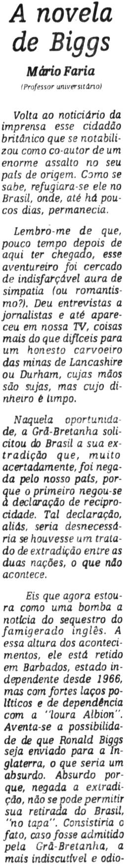 Escritor, poeta, professor e advogado, Mário Faria colaborou ativamente na Imprensa santista, escrevendo principalmente sobre temas de Direito Internacional. Seu artigo "A Novela de Biggs" foi publicado no jornal santista A Tribuna em 29/3/1981, página 29: