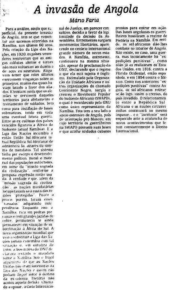 "A Invasão de Angola", artigo publicado em A Tribuna em 5/9/1981, página 23:
