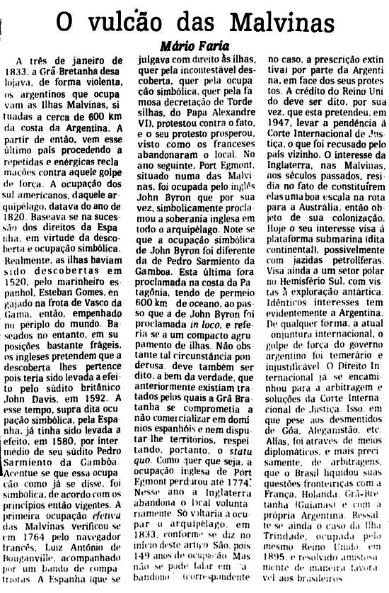 Artigo "O Vulcão das Malvinas", em A Tribuna de 18/4/1982, página 37: