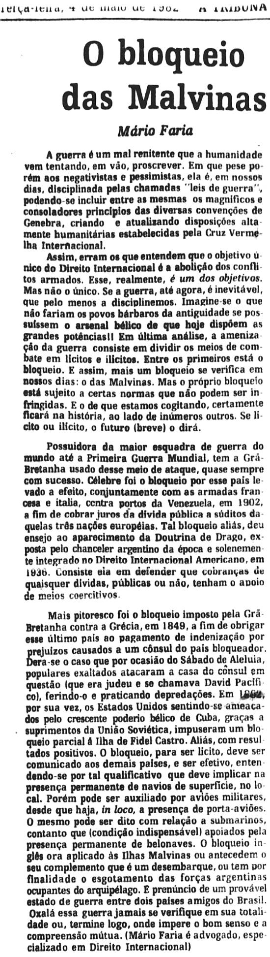 O artigo "O bloqueio das Malvinas" saiu em A Tribuna em 4/5/1982, página 2: