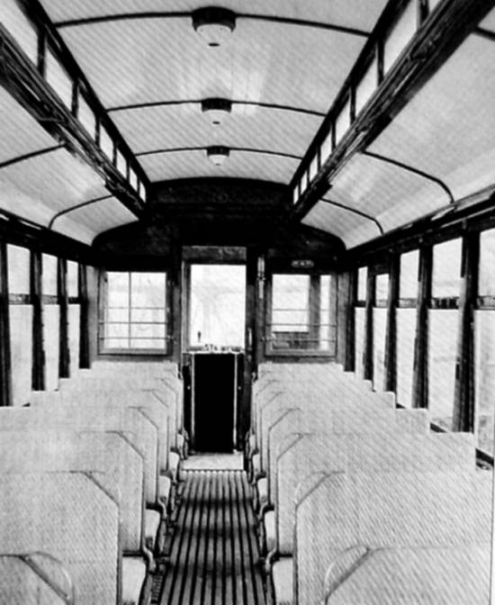 Interior de um dos bondes. Consta que todos tinham assentos estofados e reversíveis, depois alterados