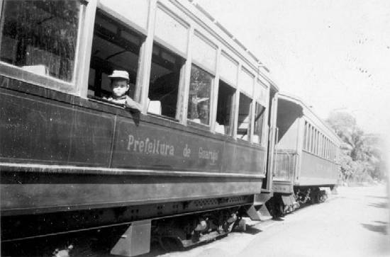 Foto do Tramway do Guarujá em julho de 1950, já operado pela Prefeitura de Guarujá, conforme se