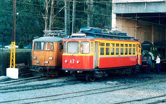 Bonde A-7 estacionado em Emílio Ribas, ao lado da Automotriz A-3, por volta de 2002. Note-se a pintura