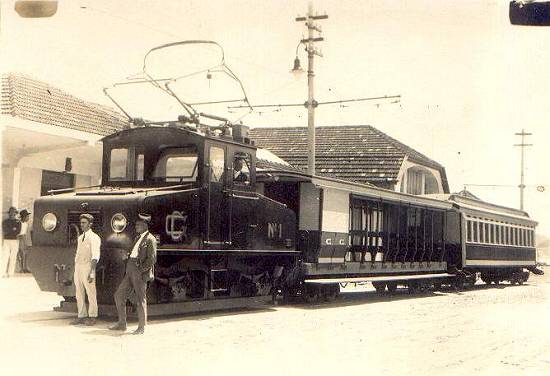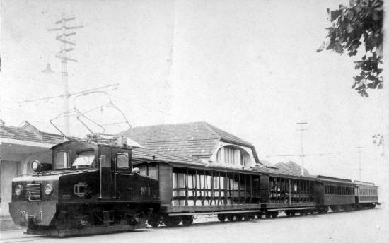 Composição de quatro carros de passageiros (dois abertos e dois fechados) e locomotiva nº 1 elétrica,
