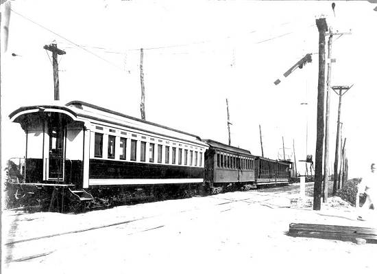 Hotel, uma locomotiva a vapor tracionando dois carros fechados de passageiros de primeira classe, na estação Guarujá