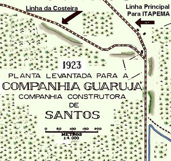 que foi aumentado e recortado para melhor visualização, temos os diversos ramais que se originavam do tronco principal na cidade do Guarujá. A data