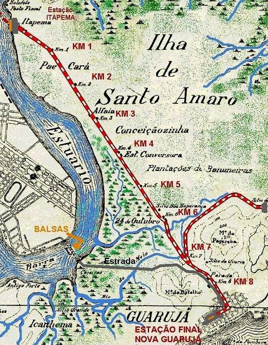 entre Santos e Guarujá, notadamente para o Grande Hotel e que teria possuído apenas cerca de 8 KM.