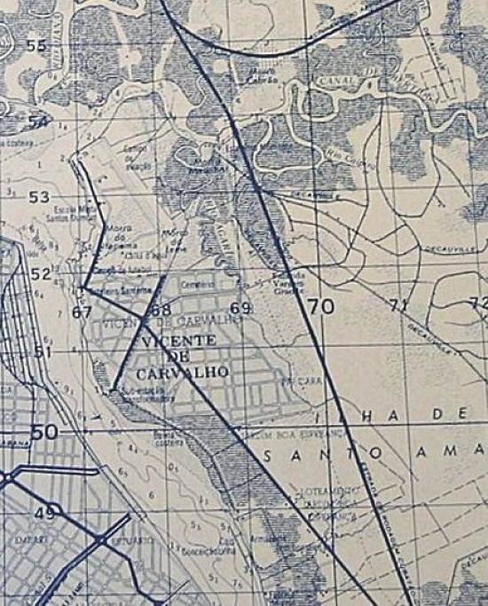 Por volta de 1960, um mapa do distrito de Vicente de Carvalho mostra ainda numerosas linhas férreas