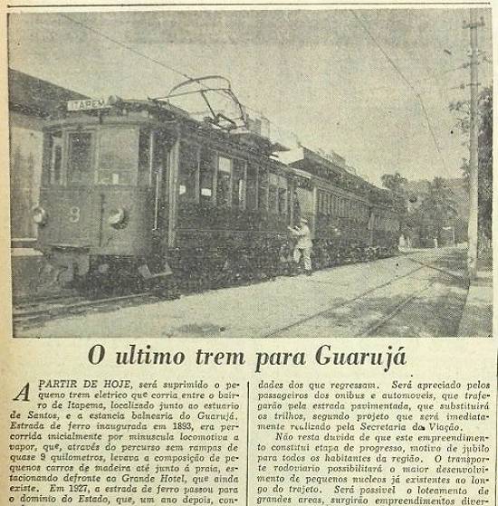 Este panorama não mais será contemplado pelos passageiros de um trem ruidoso, que avança, sacolejante, de Itapema para o Guarujá, levando a alegria dos que vão, trazendo as saudades dos