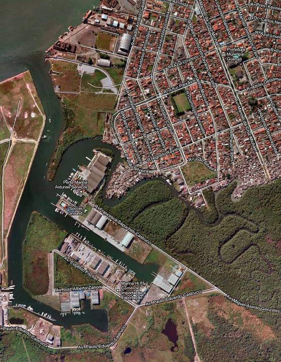 Icanhema e a Sudoeste do Rio Santo Amaro, desaguando no Estuário de Santos, em posição eqüidistante entre a foz do Icanhema e a estação do ferry-boat