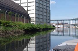 Entramos no rio tendo a Citrosuco à nossa direita, e um pequeno banco de lodo à