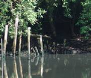 esquerda. Nele, pequenos caranguejos chama-maré (Uca sp.) moviam-se rapidamente e entravam em suas tocas com a aproximação do barco. Ao longo