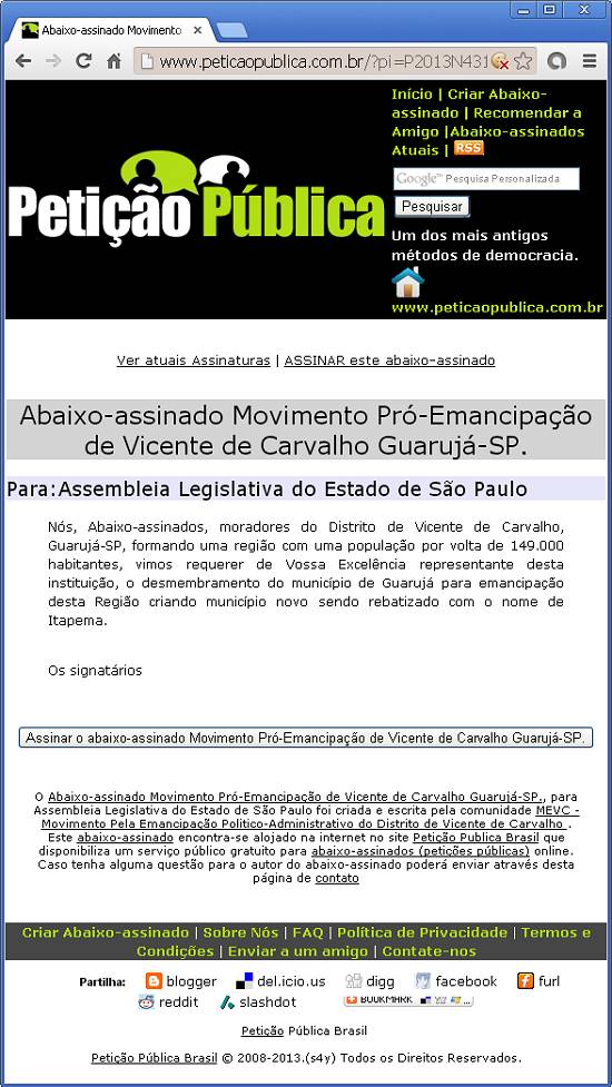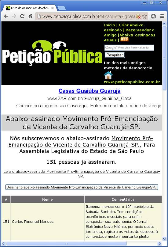 | Itapema: pedido de emancipação é levado à Assembleia Movimento para Emancipação de Vicente de Carvalho protocola pedido de apoio