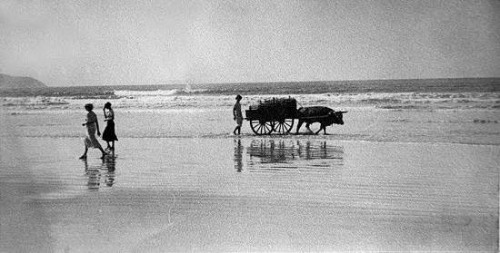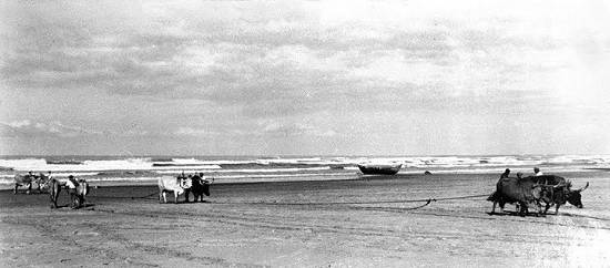 carroceiro transitando com seu carro de bois pela linha d'água, tendo ainda nas proximidades um barco a vela, possivelmente usado para o transporte de