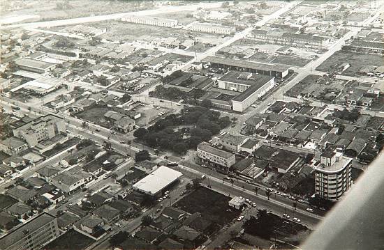 destaque ao centro para as instalações antigas da Prefeitura de Praia Grande (depois ocupadas pela escola Fatec), defronte à arborizada Praça 19 de