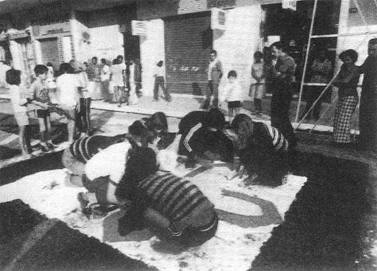 atração turística. Desde a madrugada, centenas de pessoas trabalham sem cansar, fazendo "tapetes" e "quadros" com os mais variados materiais, nas