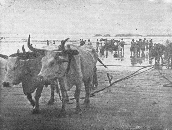 A rede puxada a boi tinha 200 braças e se utilizava de 48 bois (no trabalho,