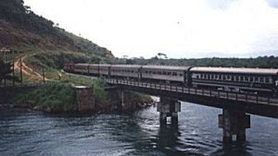 A composição passando por sobre o rio Itanhaém, sentido Peruíbe, nos anos 1980