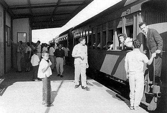 Trem aguardando partida na estação do Suarão, em 1956. Notar os caros de madeira