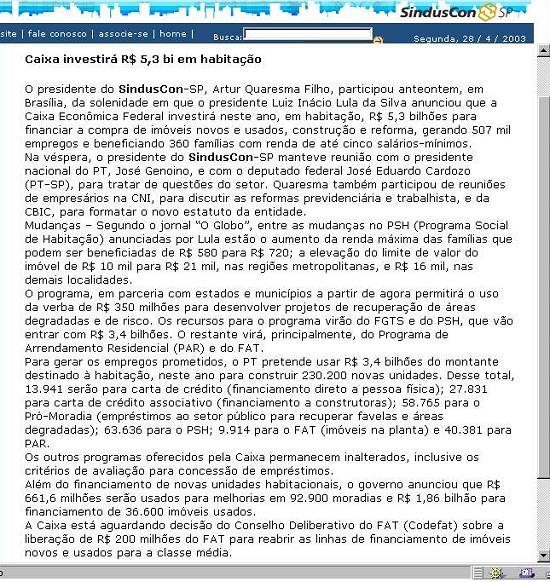 Web do Sinduscon-SP noticia a liberação das verbas para Habitação