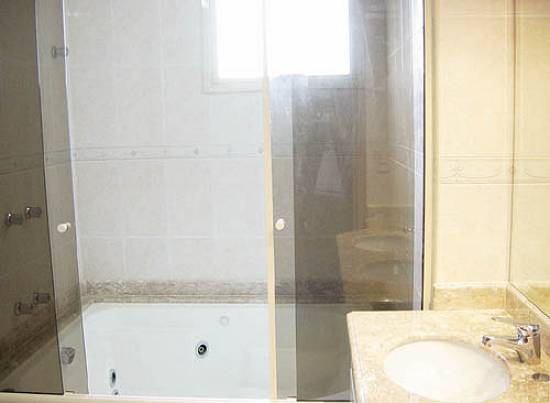 com acabamento em granito branco Nepal e banheiros em mármore travertino.