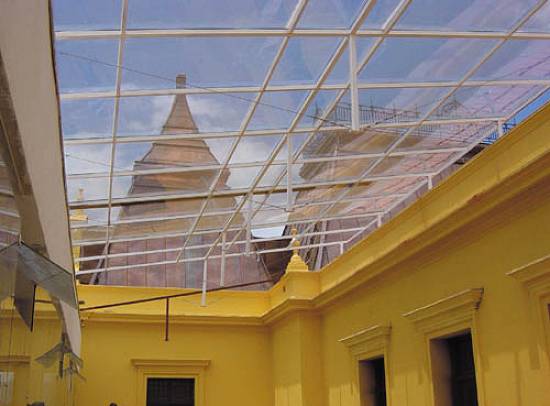 de policarbonato entre os dois prédios, mostrando,