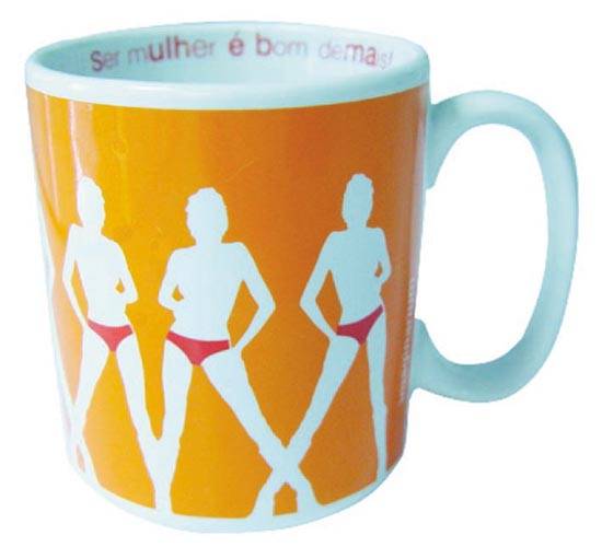 a camisola em rosa, e a caneca também em laranja. As cores quentes