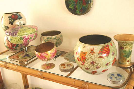 Lourdes utiliza a técnica de colagem em vidro ou espelho. Os objetos
