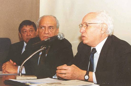 José Goldenberg ao microfone, ladeado por Rubens Lara e Jorge Moya