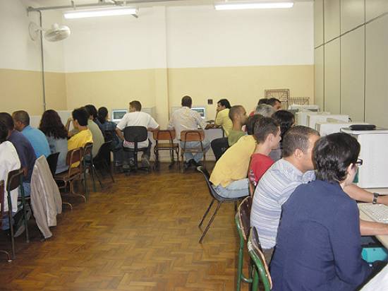 com 15 computadores, cada um usado por dois alunos, com os programas AutoCad