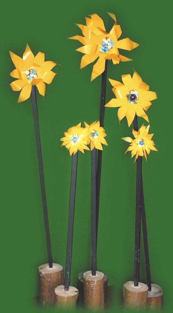 Iramar mostra 11 girassóis de alumínio em suporte de ferro